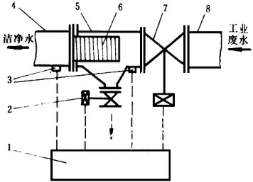 1、控制器2、排污電磁閥3、壓力傳感器4、出口管道5、過濾器殼體6、過濾介質(zhì)7、管道電磁閥8、入口管道。
